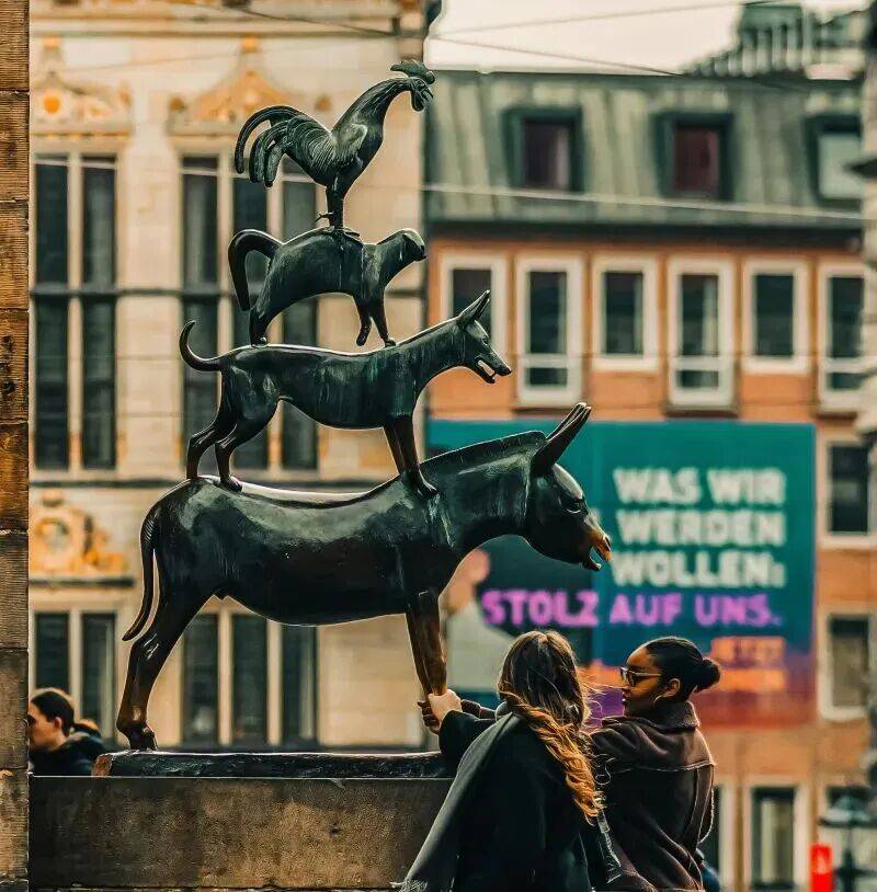 市政厅的西面有一座“不来梅的音乐家”雕像,格林兄弟创造出的举世闻名的童话形象,是不来梅人的骄傲。这里是德国”格林童话之路“的最后一站。